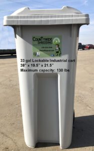 Whether you are doing a purge, need us on-call, or need shredding on a schedule – we are the company for you! If you are looking for scheduled shredding on a weekly, monthly or quarterly basis – we will work with you to design a solution that best suits your business needs. We have lockable shredding carts in 32, 33, 64 or 96 gallon size to select from – you pick the size that works best for your environment.